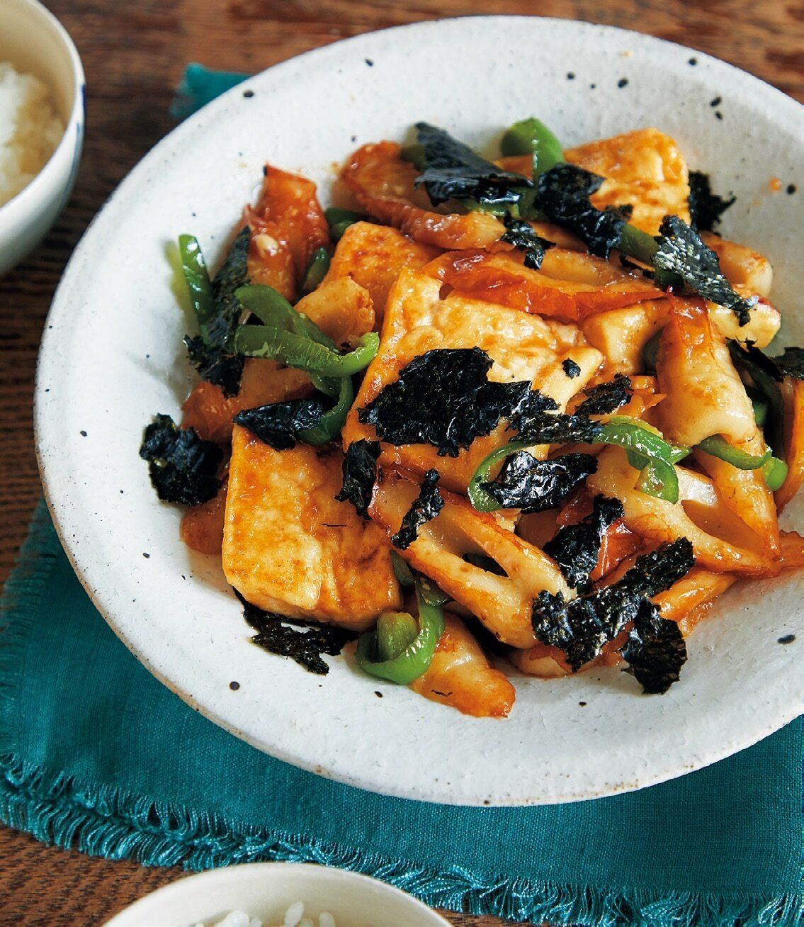 (3)フライパンを拭き、[A]を入れて中火で炒める。ピーマンがしんなりしたら豆腐を戻し、[B]を加え、火を強めて炒め合わせる。火を止め、焼きのりをちぎって加え、さっとからめる。