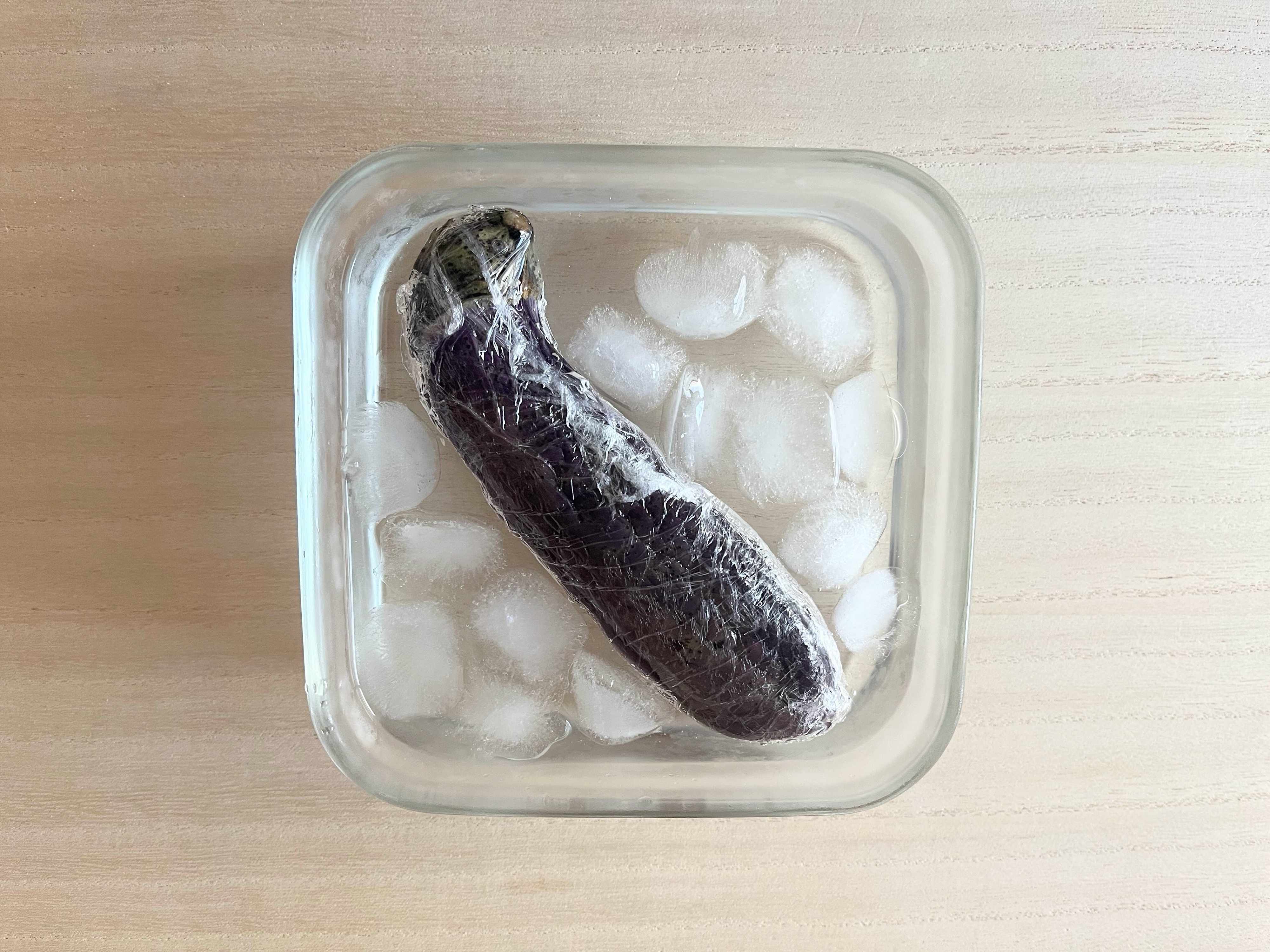 取り出したなすを氷水で粗熱を取ります。