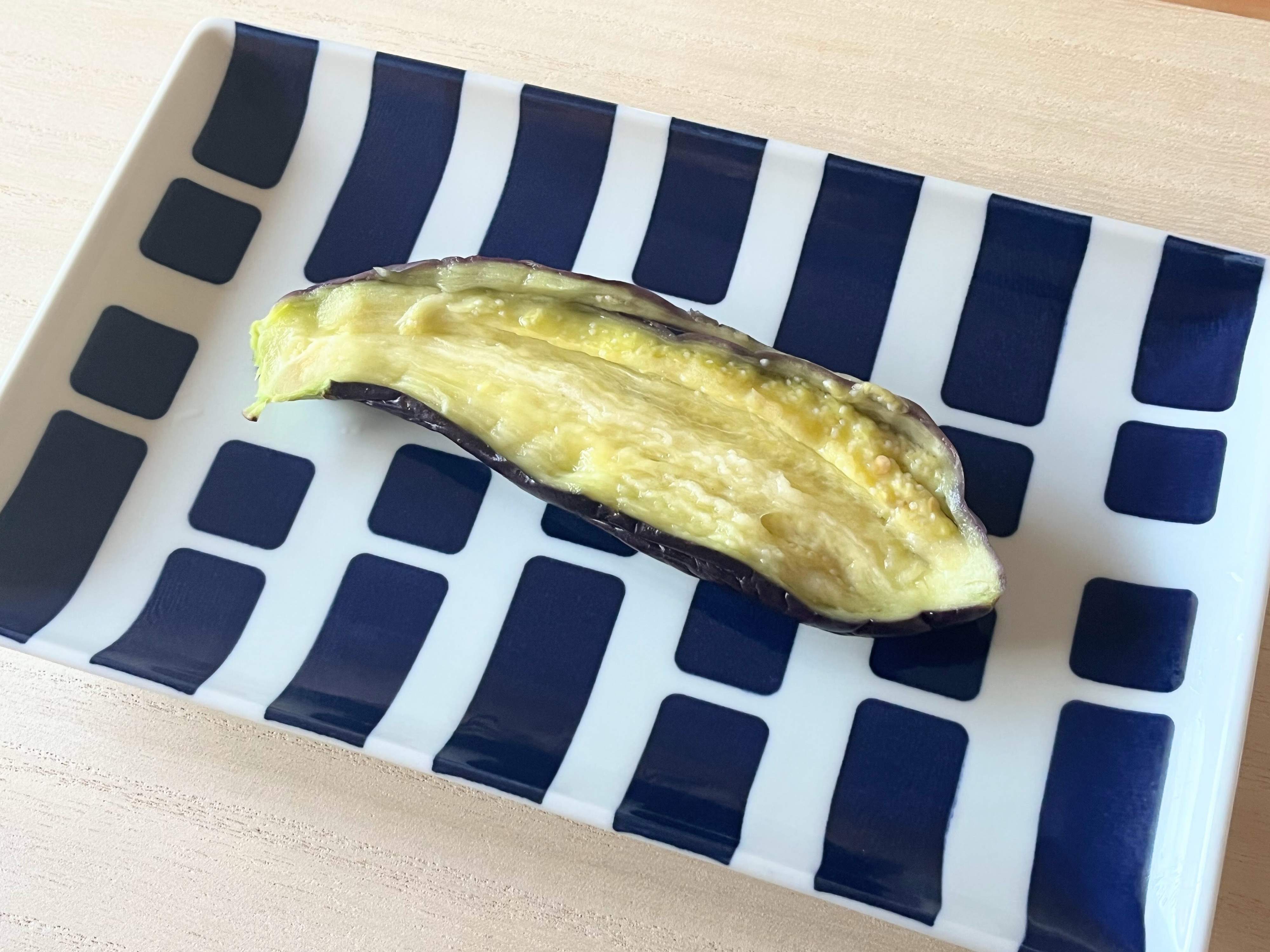穴をあけて電子レンジに入れましたが、3分加熱しても水分が抜けている感じはなく、なす本体がギュッと引き締まったような仕上がりに。手に取った感触もトロッと感はまだありません。