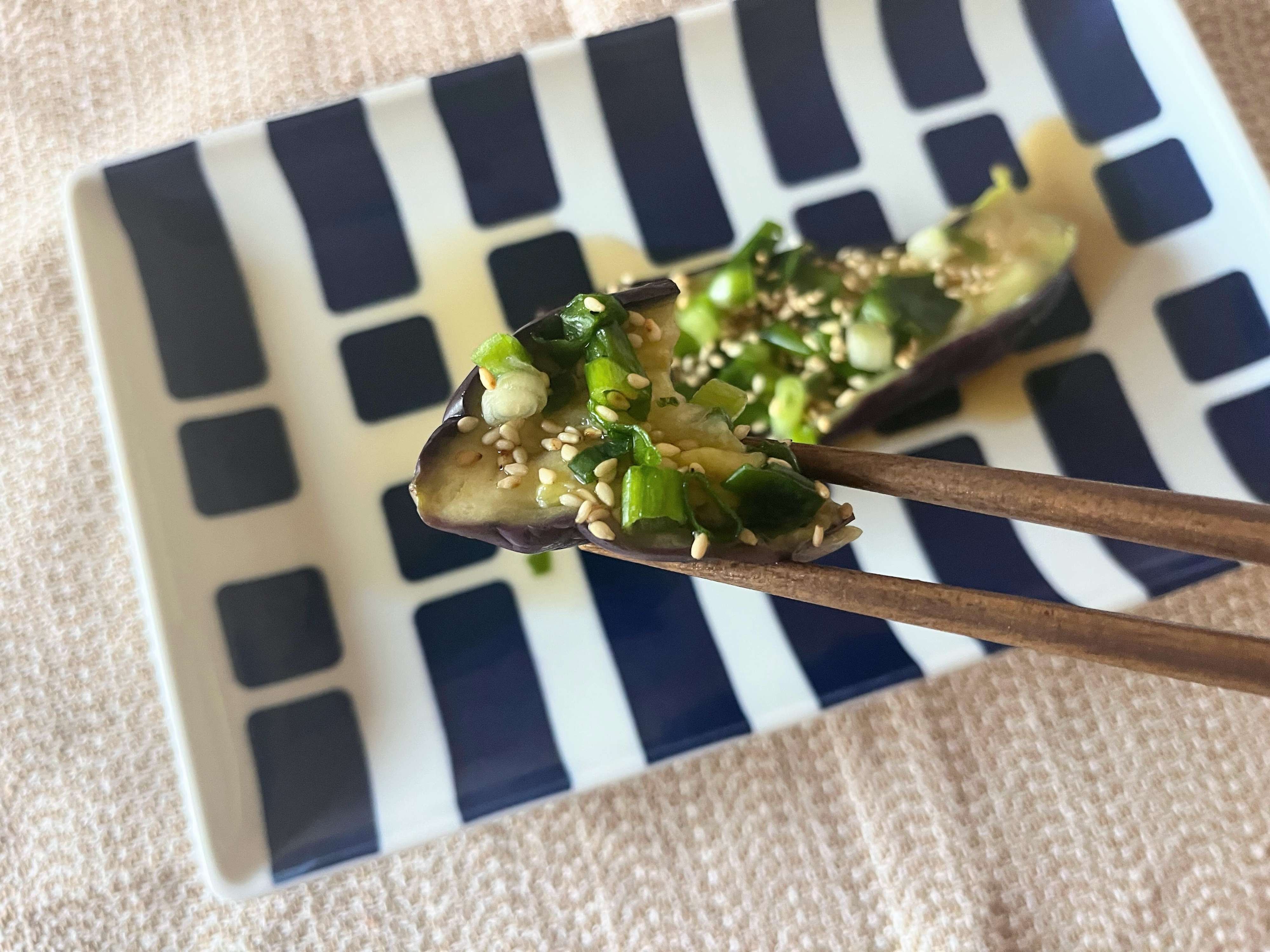 電子レンジで加熱しただけとは思えないほど、なすのうまみがギュッとつまっていて、麺つゆと薬味だけで十分でした。