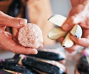 なすの切り目を広げて持って、丸めたたねを詰める。