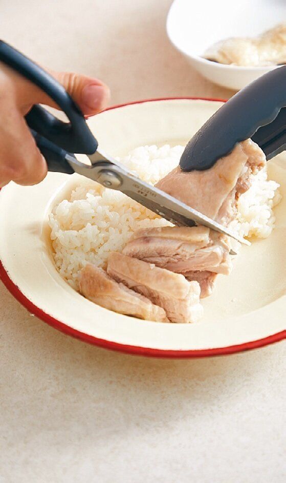 (1)炊飯器の内がまに米と[A]を入れて混ぜる。鶏肉に塩少々をまぶして入れ、空いた所にじゃがいもを皮つきのまま、まるごと加えて炊飯する。