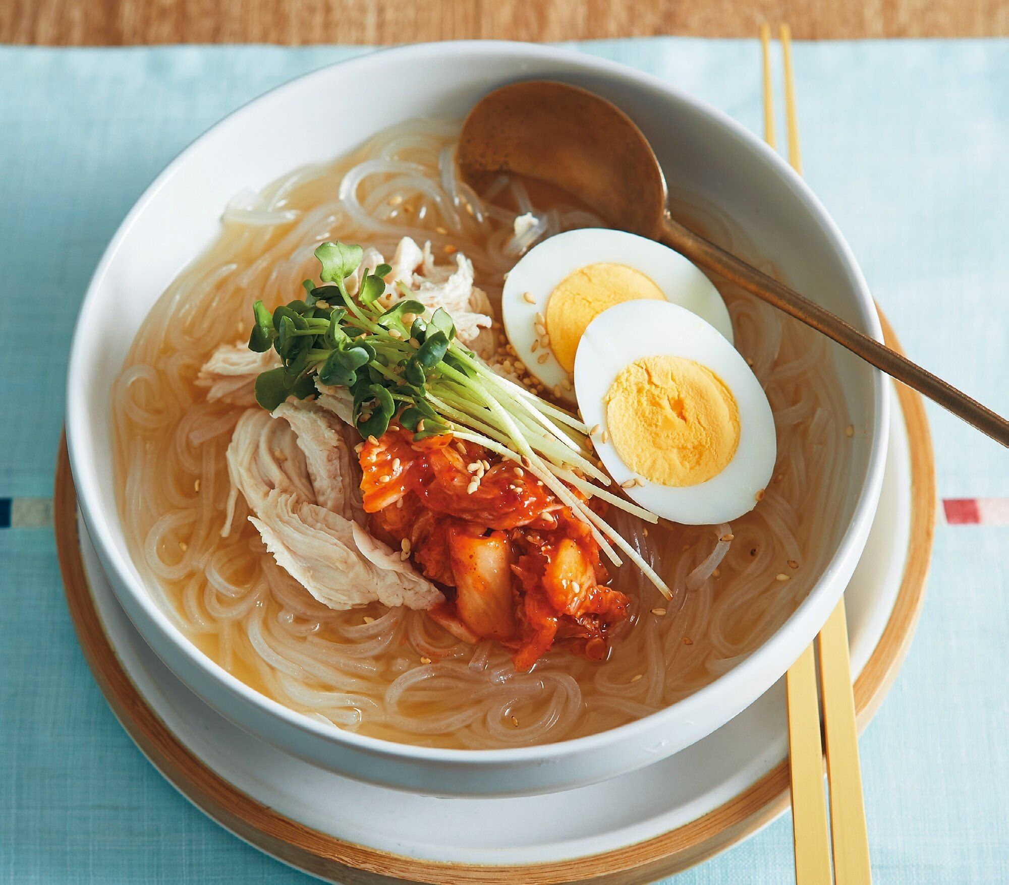 (3)鶏肉を手で食べやすくほぐしながら(2)にのせ、ゆで卵、キムチ、貝割れ菜をのせる。白ごまをふり、好みで酢をかける。