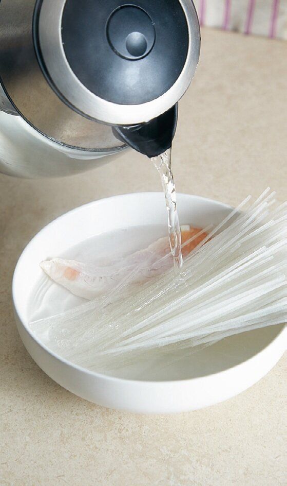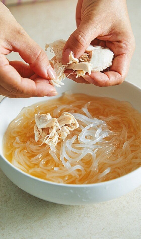 (1)深さのある耐熱の器にマロニーと鶏肉を入れ、熱湯2 1/2カップを注ぐ。ラップをふんわりと掛け、電子レンジで5分加熱する。
