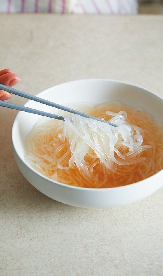 (2)(1)のマロニーをざるに上げて冷水で洗い、水けをきってマロニーを器に盛る。[A]を加えてよく混ぜる。