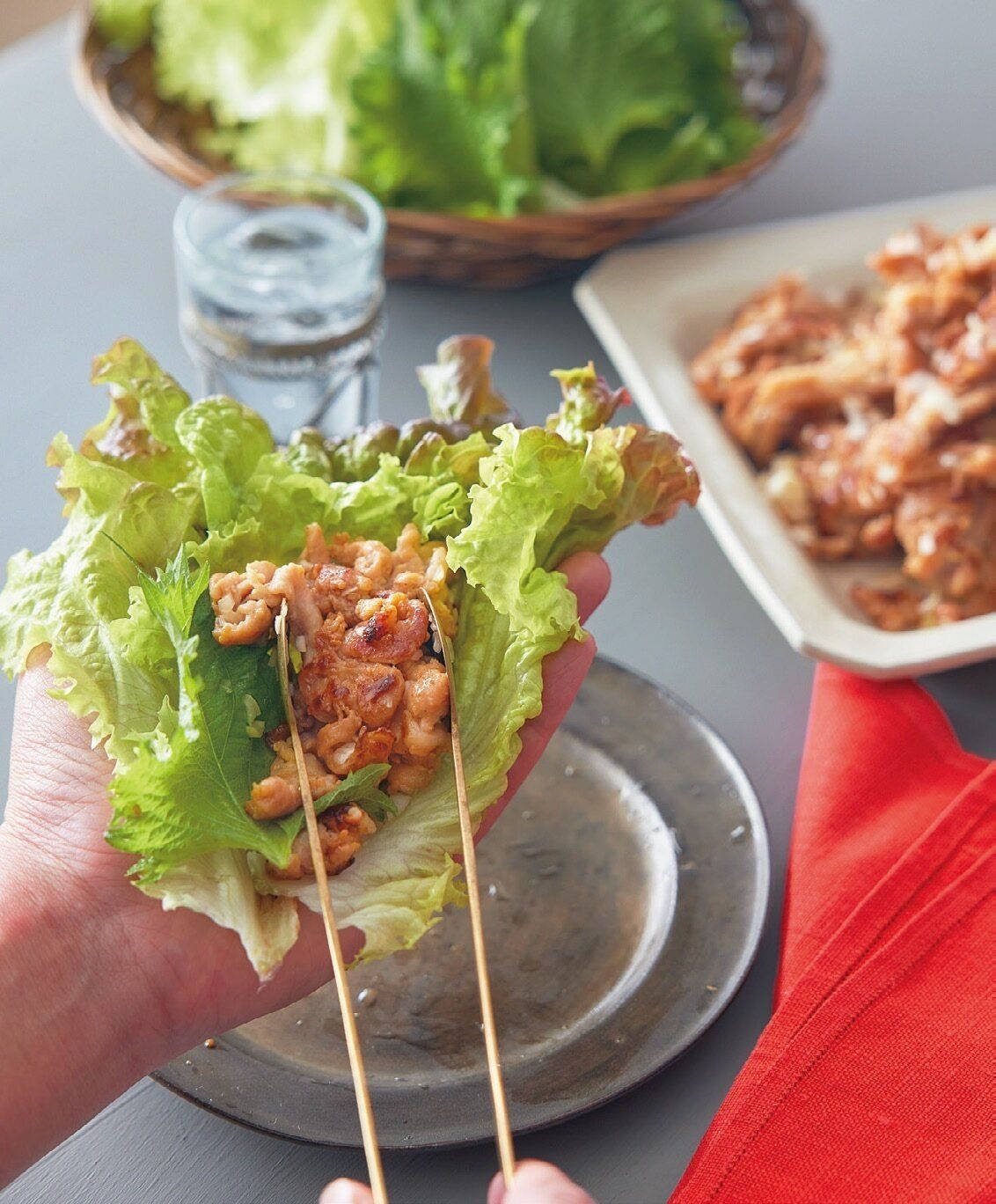 (1)サニーレタスと青じそは水に浸してパリッとさせ、水けをしっかりきる。