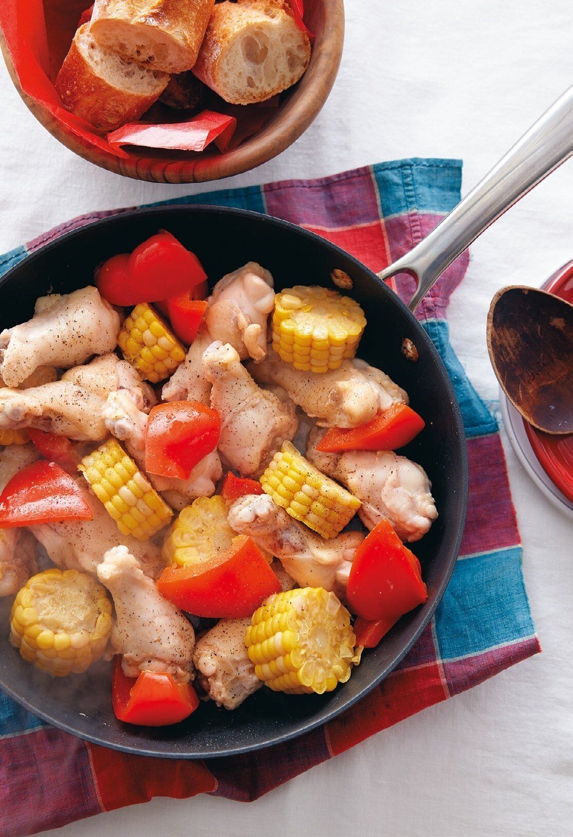 (1)フライパンに鶏肉、とうもろこし、パプリカ、水1/2カップを入れて中火にかける。煮立ったらふたをし、約8分蒸す。途中で水分がなくなったら、水少々をたす。