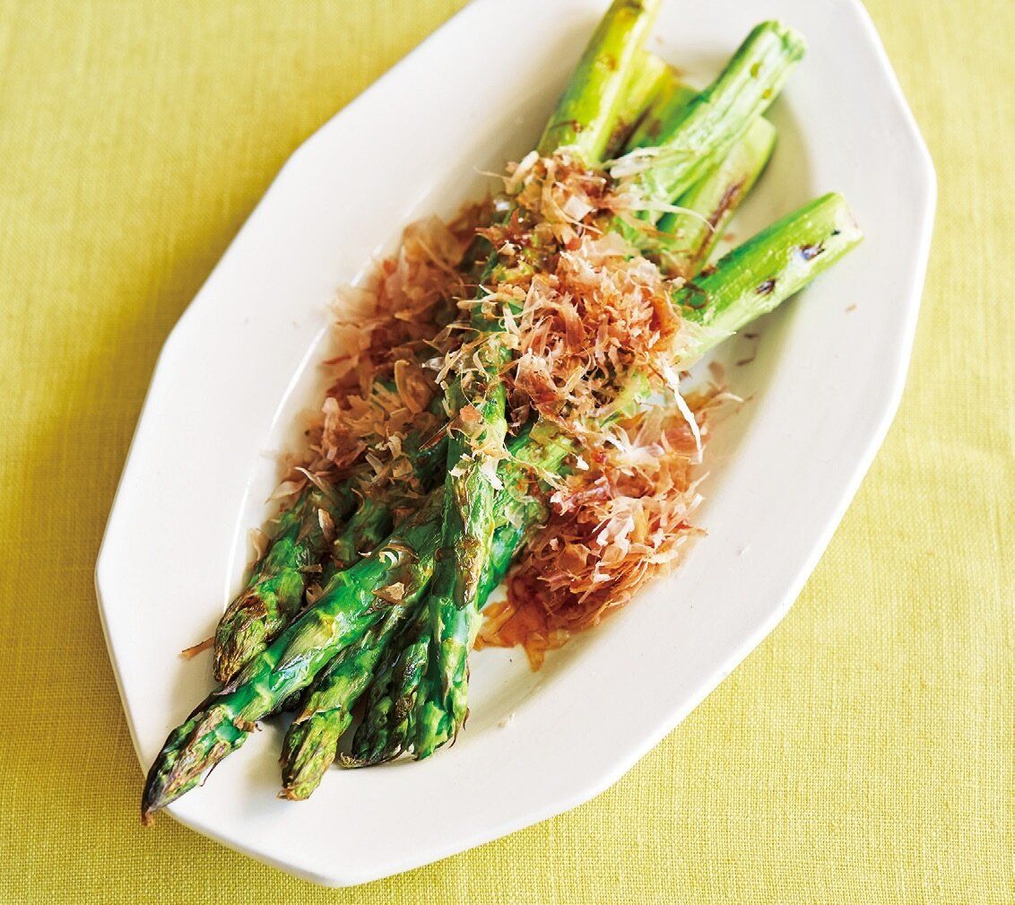 アスパラガスを天板かアルミホイルにのせ、油を回しかけて全体になじませる。オーブントースターで焼き色がつく程度まで約7分焼いて器に盛り、削り節としょうゆをかける。