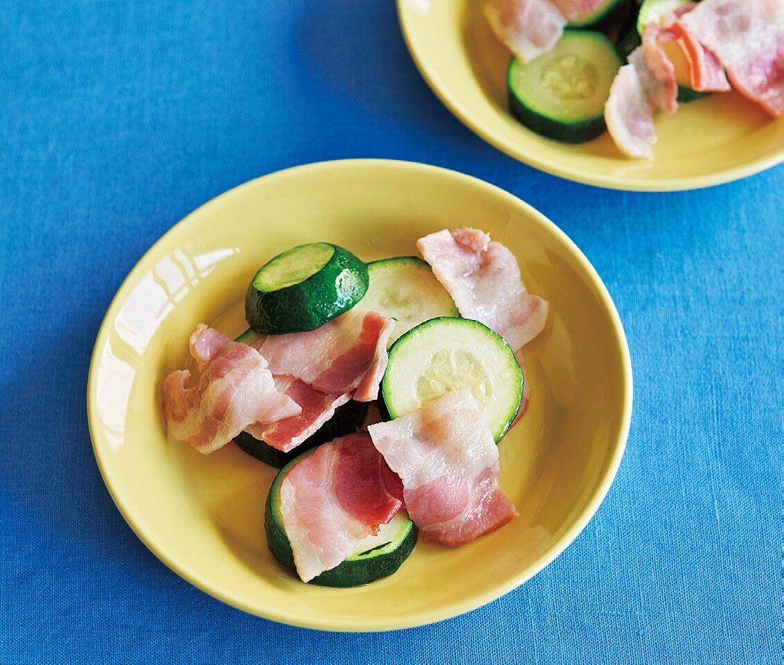 耐熱皿にズッキーニを並べてベーコンをのせ、ラップを掛けて電子レンジで4分加熱する。
