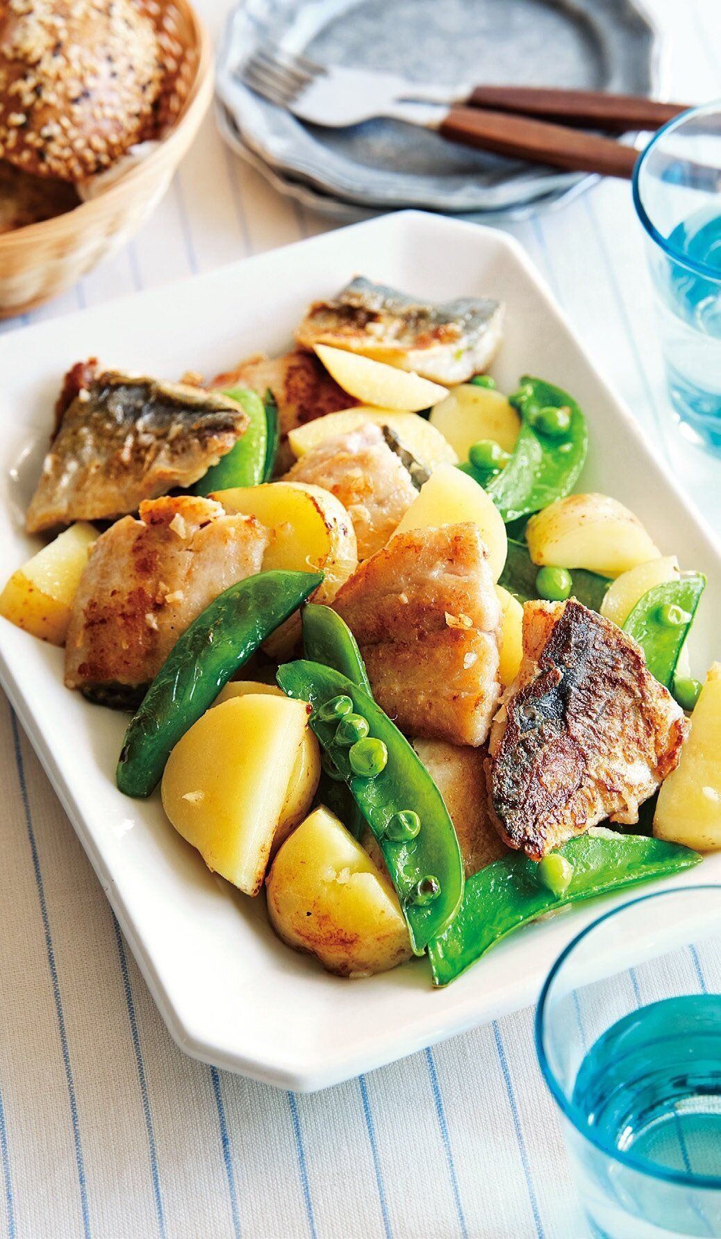 余分な油を拭き取り、にんにく、バター、じゃがいも、スナップえんどうを加え、あじがくずれないようにして全体にバターをなじませるように混ぜ、約3分炒める。野菜と炒め合わせる。