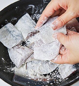 薄力粉はフライパンの中でまぶして洗い物を少なく。焼くための油は上からかければOK。
