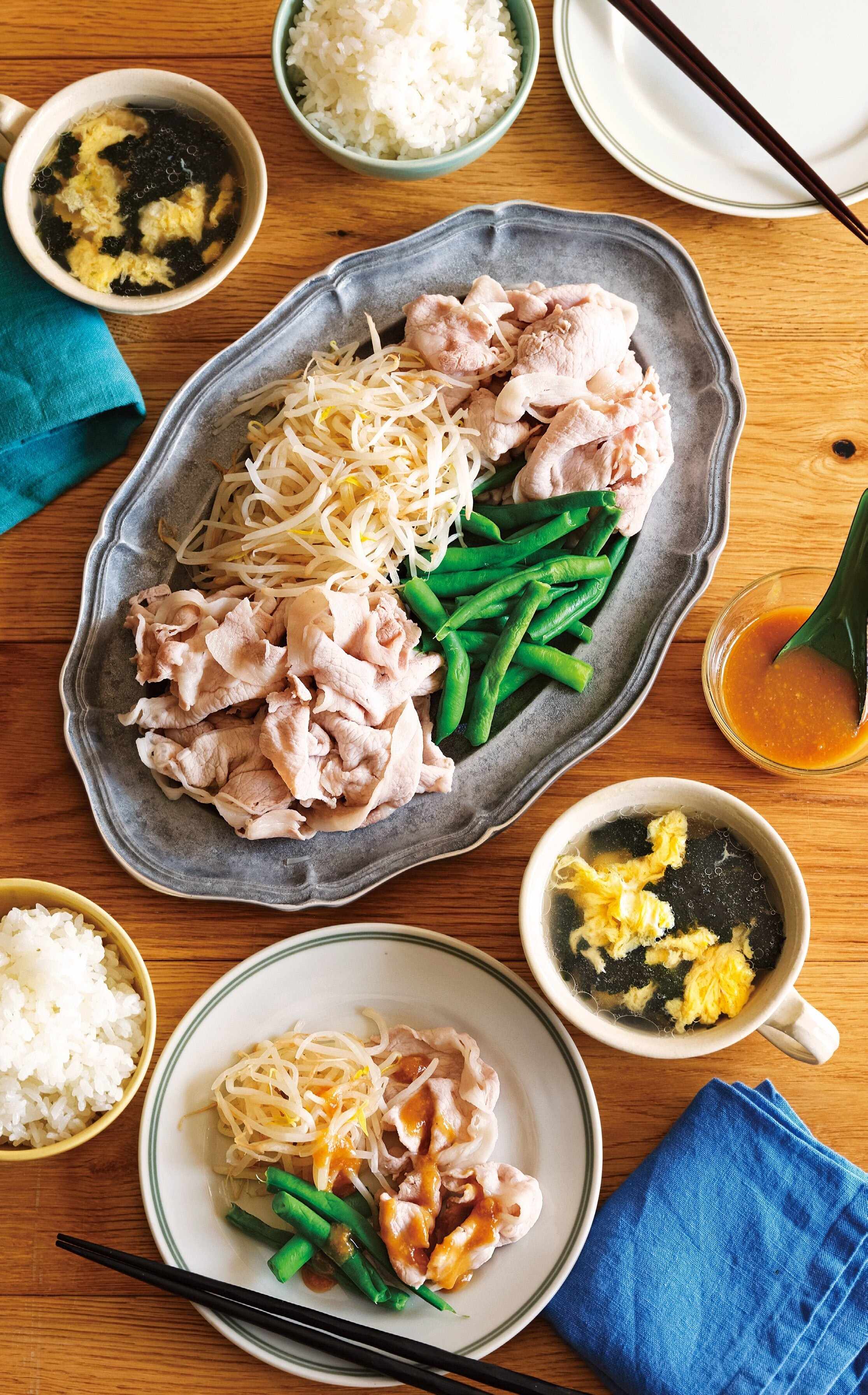 湯が沸いたら中火にして塩小さじ2(しっかりと塩味のつく分量)を入れ、さやいんげん(約1分30秒)、もやし(再沸騰してくるまで)、豚肉(2回に分けて・色が変わるまで)の順にゆで、それぞれ水けをきる。器に盛り、辛子酢みそを添える。