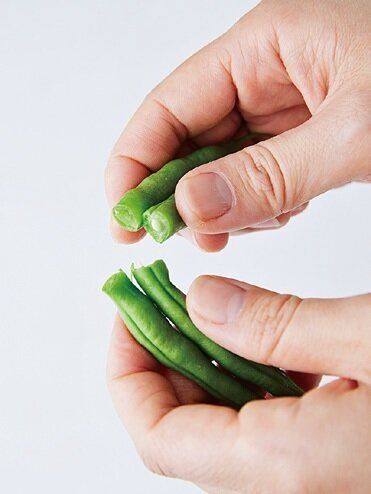 さやいんげんは、へたを手で取って半分に折る。辛子酢みその材料を混ぜ合わせる。