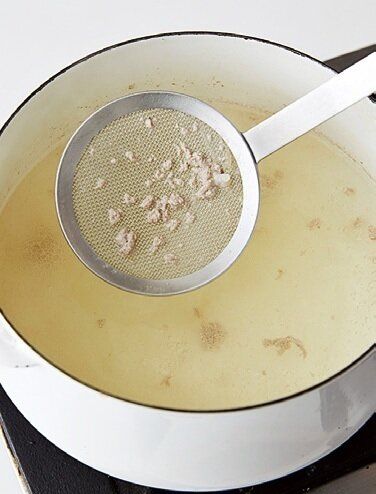 ゆで汁のアクをすくい、水200mlをたして強火で温める。