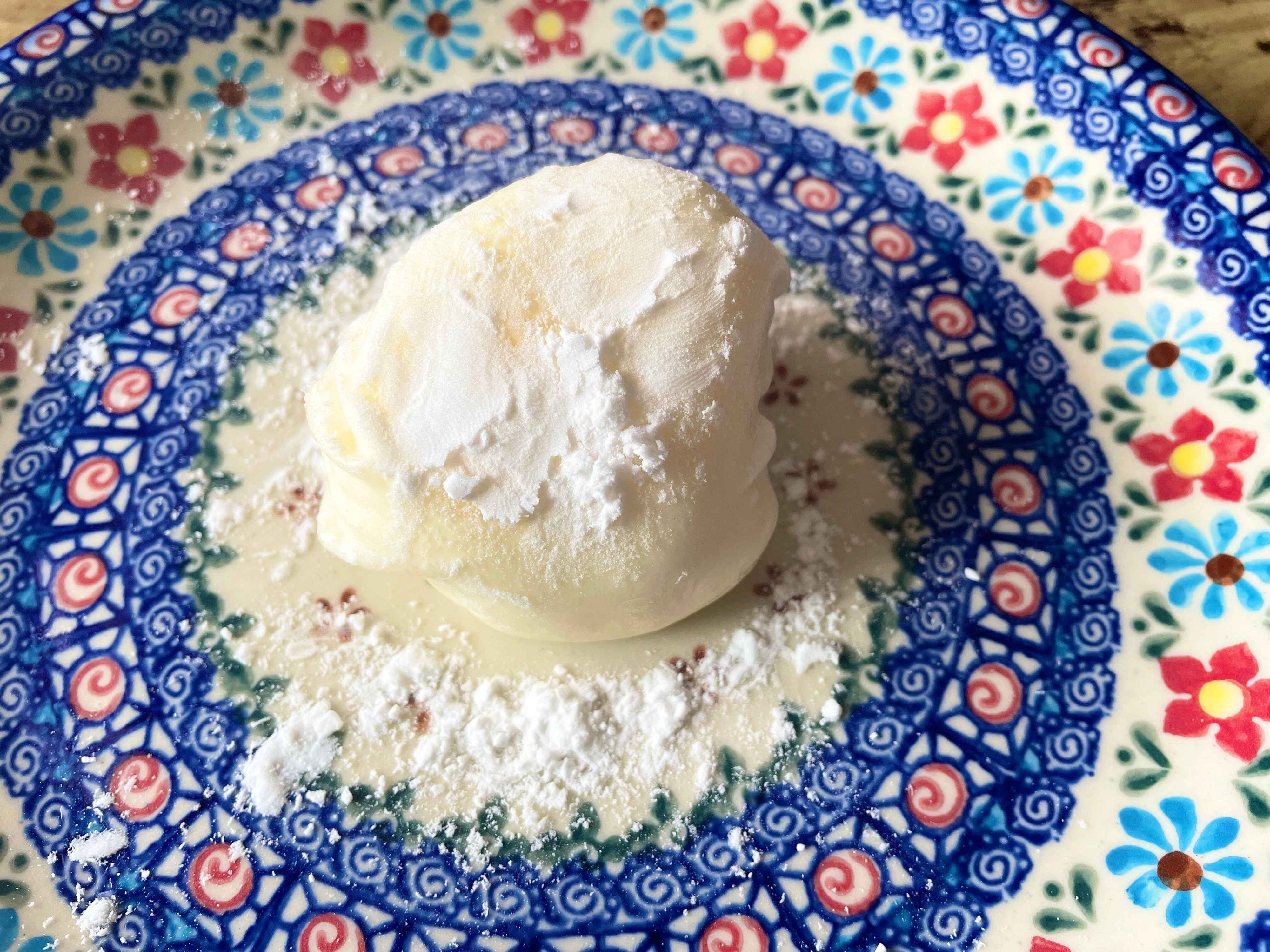 ライスペーパーで包むだけで大福になるの?と半信半疑でしたが、できあがった見た目は確かに「だいふく風アイス」そっくり!食べてみると、ライスペーパーのモチモチ感が確かにだいふくです。