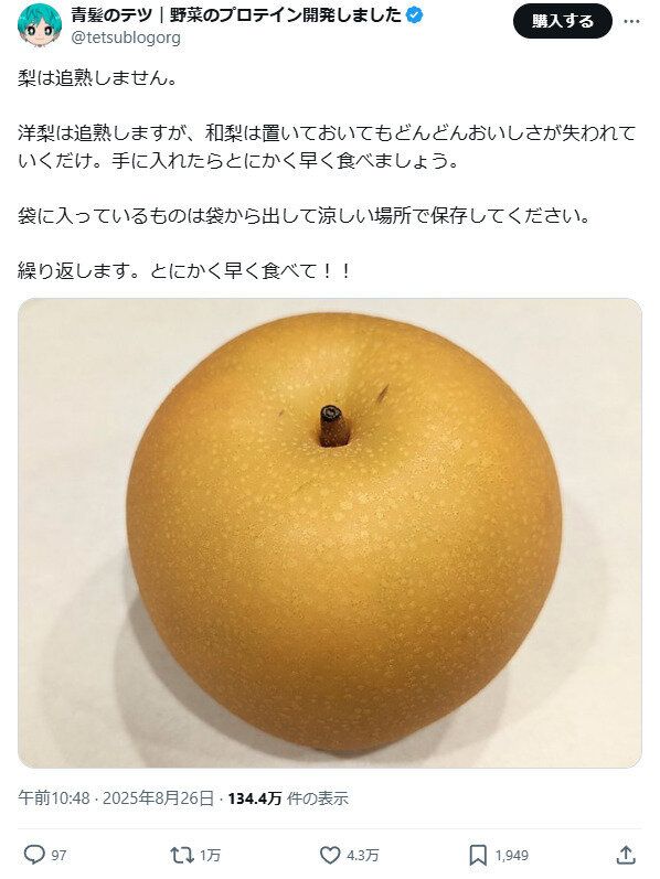 そんなある日、青髪のテツさんの投稿で「和梨は追熟しません!とにかく早く食べて!!」という投稿が目に飛び込んできました。