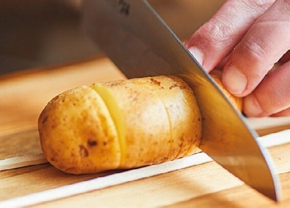 (1)じゃがいもは皮つきのまま6~7mm間隔で切り込みを入れる。このとき、下まで切り離さないように、両側に割り箸を添える。ラップで包み、電子レンジで4分加熱する。