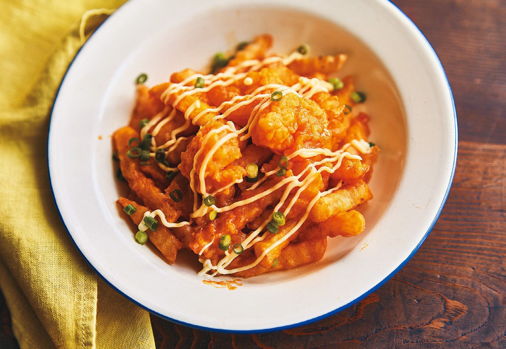 フライドポテト、温めたえびチリをさっと混ぜて器に盛り、マヨネーズをかける。好みで小口切りにした万能ねぎを散らす。