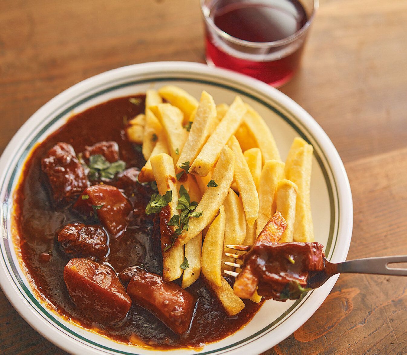 フライドポテトと温めたビーフシチューを器に盛り合わせ、好みで刻んだイタリアンパセリを散らす。ポテトにビーフシチューをつけながら食べる。