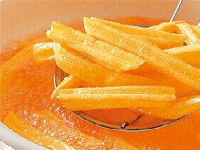 一口に「じゃがいも」といっても、一般にフライドポテトには、水分が多く皮が薄い物が向きます。表面を押すとカチコチなくらい硬いものが良品。硬さは水分が多い証拠で、揚げるとみずみずしくてクリーミーに。