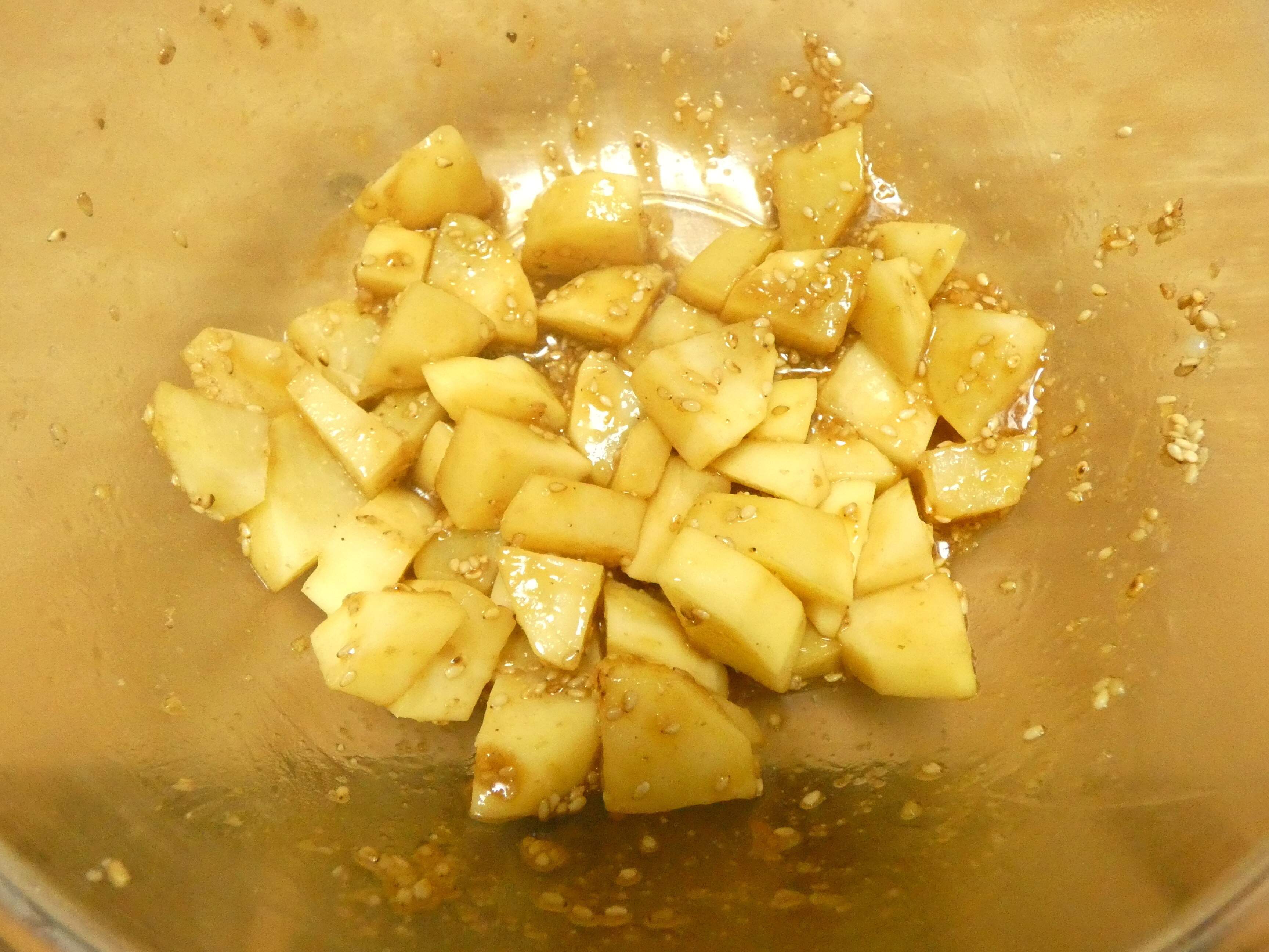 新じゃがを使う場合は皮つきでもOK。片栗粉を混ぜると味がよく絡みます。一度取りだし混ぜ合わせてからもう一度レンジ加熱すると、全体にムラなく火が通ります。