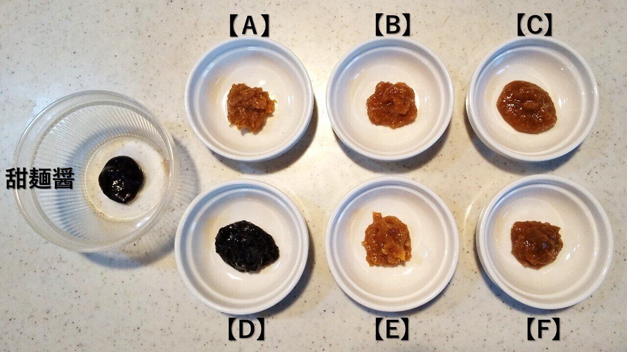 画像中央左が比較対象の「甜麺醤」、上段左から順に【A】【B】【C】、下段左から順に【D】【E】【F】となっています。