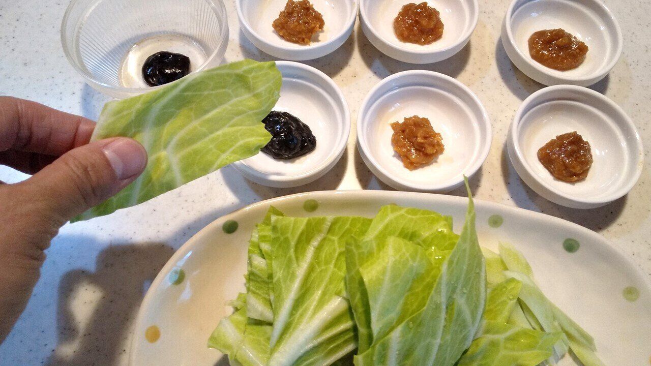 今度は、生野菜(キャベツ)を食べやすい大きさに切り分け、代用甜麺醤を適量つけて食べ比べてみました。