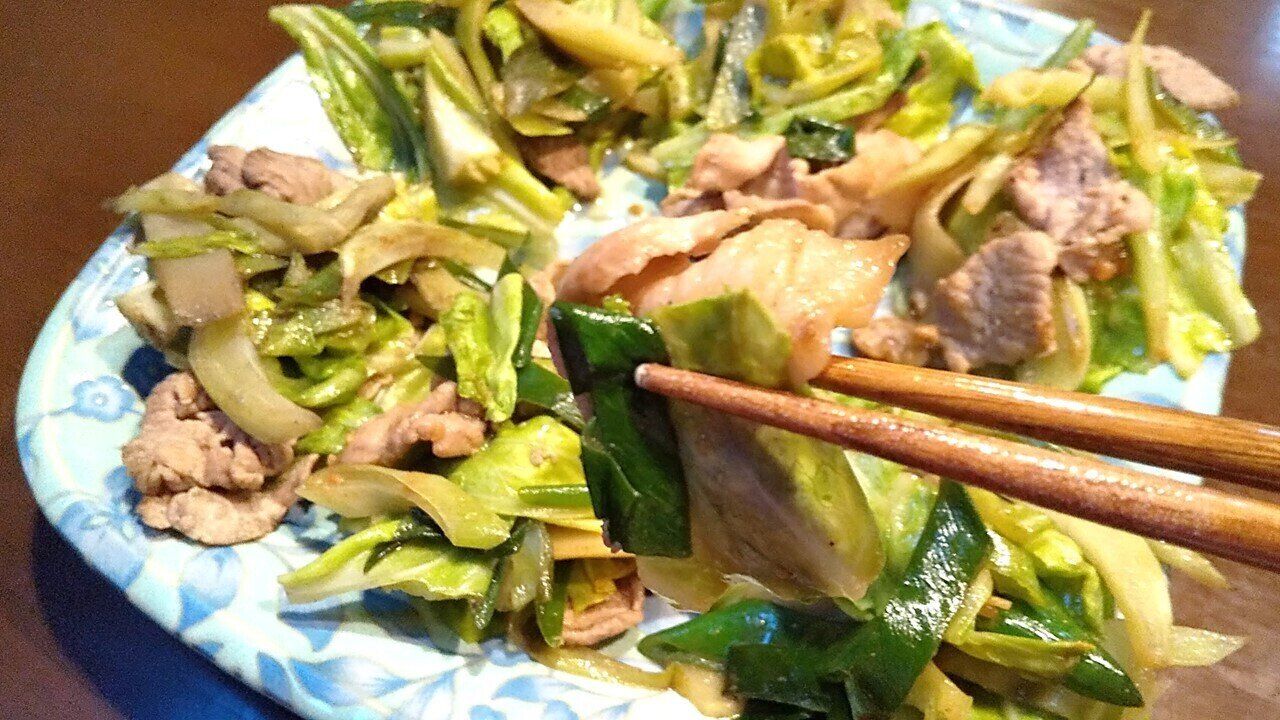 つぎに、キャベツ、長ねぎ、豚肉を切ってにんにくとごま油で炒め、濃口醤油、酒、代用甜麺醤を混ぜ合わせて味付けするホイコーローをつくってみました。(一般的には豆板醤も使って辛味を加えますが、今回は家族全員で試食するため省いています)