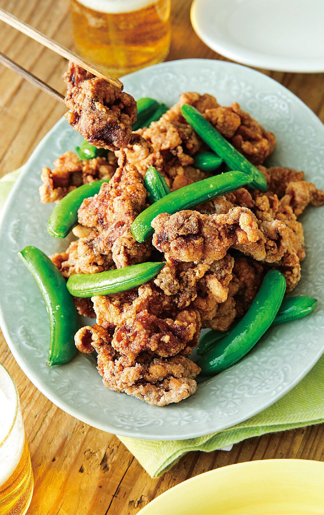 スナップえんどうも揚げ油に入れて約1分揚げる。豚肉とともに器に盛る。
