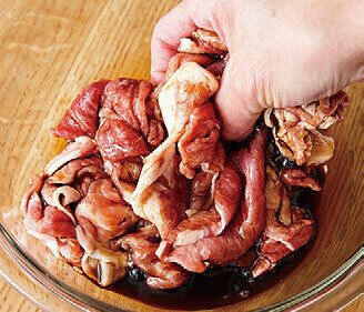 下味の材料はウスターソースだけ。ウスターソースは香味野菜が入っているので、にんにくやしょうがを使わなくてもおいしいから揚げに。