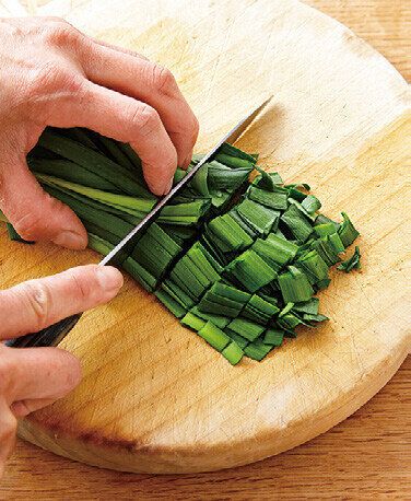 (ワタナベさん)にらは長いとかみ切りにくく食べづらいことがあるので、短く切りました。