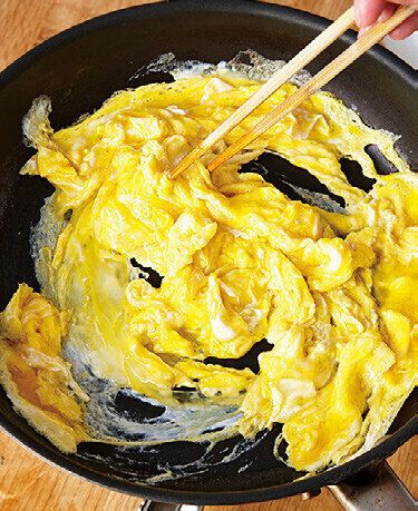 フライパンにごま油大さじ1を入れて中火にかける。卵液を入れてかき混ぜ、半熟になったら一度ボウルに取り出す。