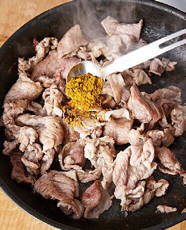 (2)のフライパンにごま油少々をたして豚肉を入れ、焼き目がつくまで中火で炒める。カレー粉、塩小さじ1/2、にらを加えてさっと炒め、(2)を戻し入れ、しょうゆを加えてさっと炒め合わせる。