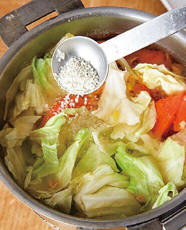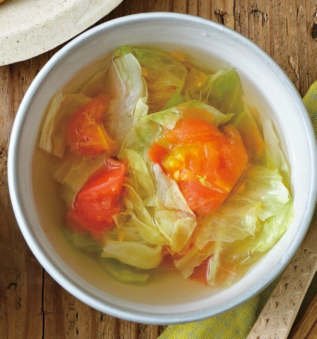 (ワタナベさん)カレー粉は仕上げに加えると風味がとびません。もう一品は、カレー味のおかずと相性のいいトマトを入れた、さっぱりとしたスープを組み合わせました。キャベツもトマトも最初からだし汁に入れて火にかけていいんですよ。
