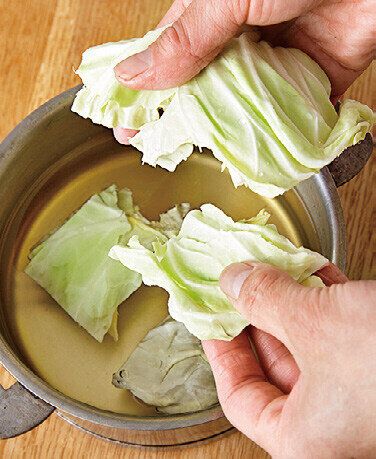 鍋にだし汁、おろししょうがを入れる。キャベツを食べやすい大きさにちぎって入れ、トマトを2cm角に切って入れる。