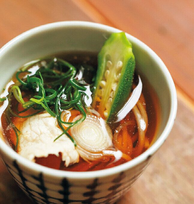 (1)鍋にたっぷりの湯を沸かし、おかひじきを約1分、オクラを約2分ゆで、湯は捨てずに湯をきる。オクラは縦半分に切る。続いて豚肉をさっとゆでて湯をきる。