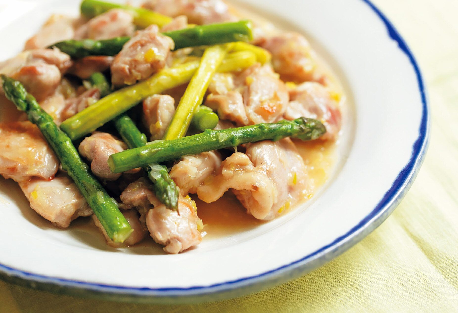 (2)フライパンに米油を中火で熱し、鶏肉を入れて4~5分焼く。こんがりとした焼き色がついたら返し、アスパラガスを加えて約2分焼く。