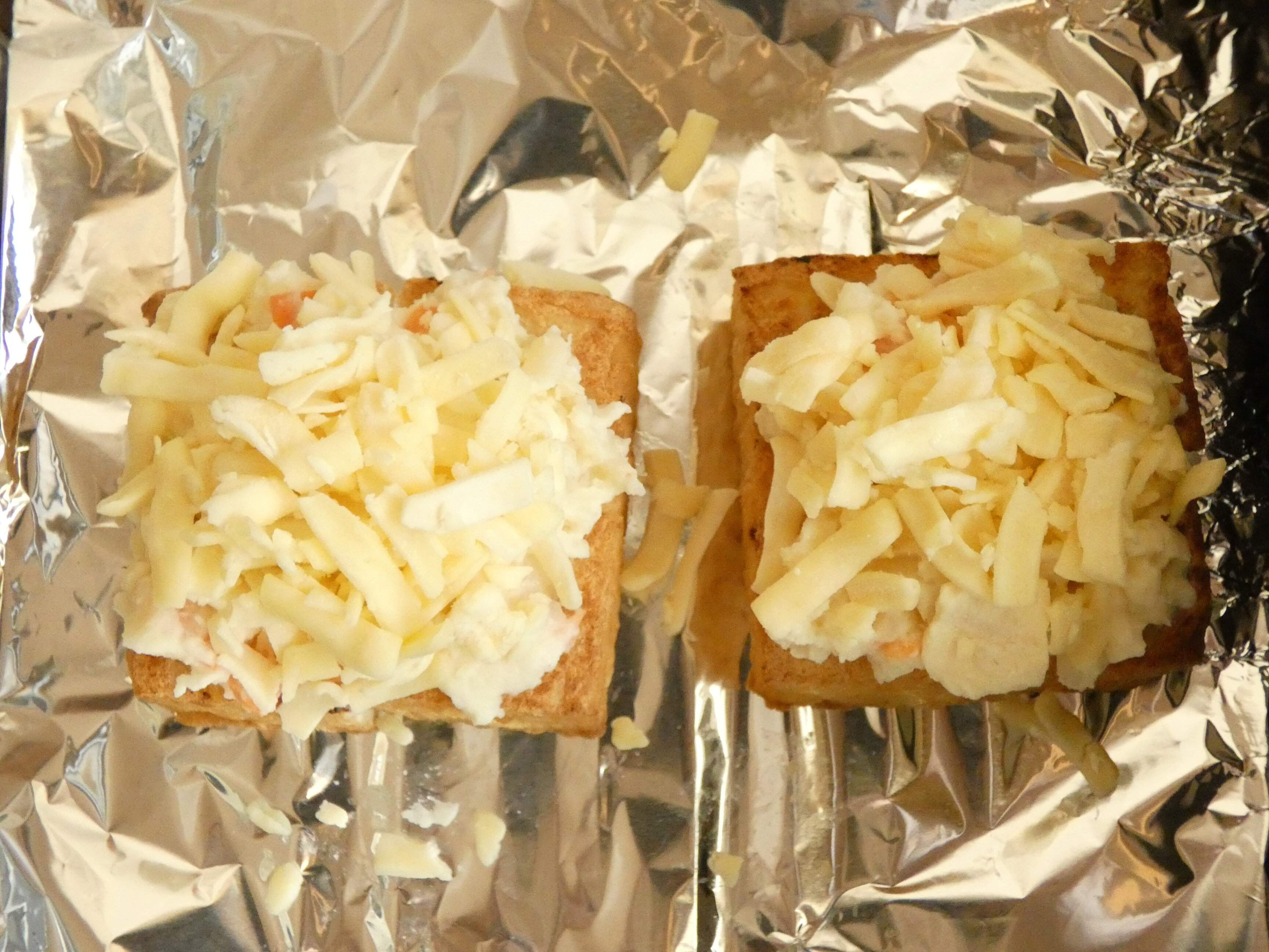 2.一度取りだしてポテトサラダとピザ用チーズを乗せ、さらにトースターで焼きます。チーズがとろ~り溶けたら完成。