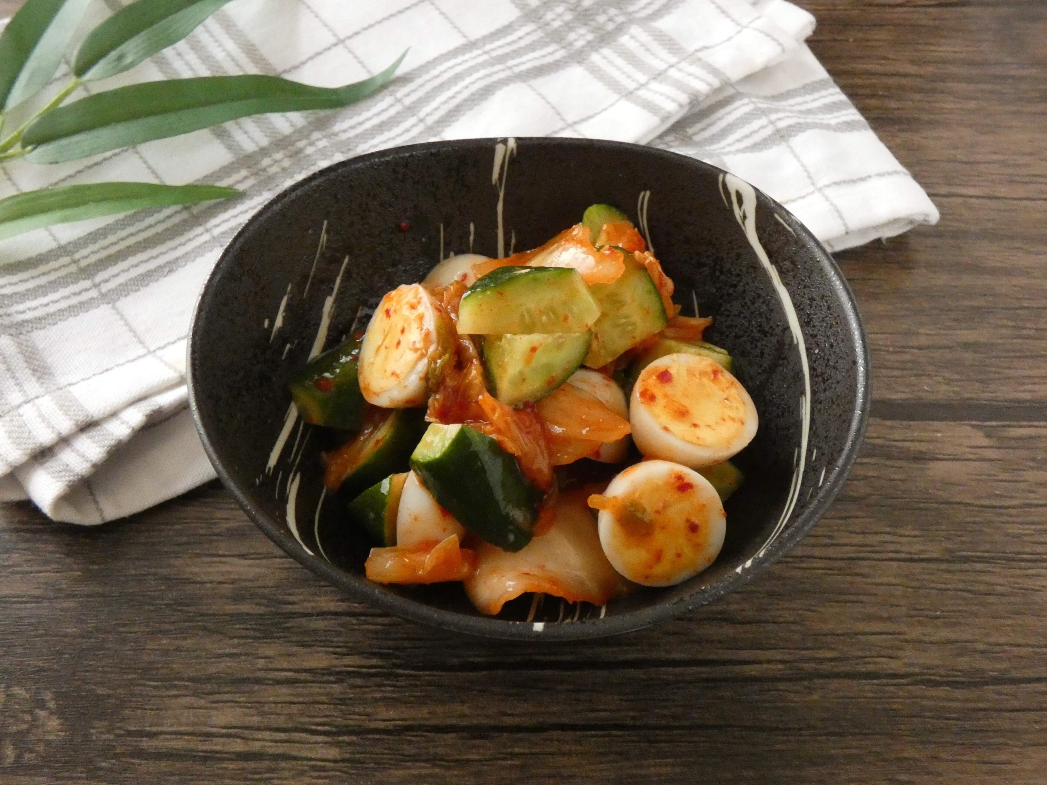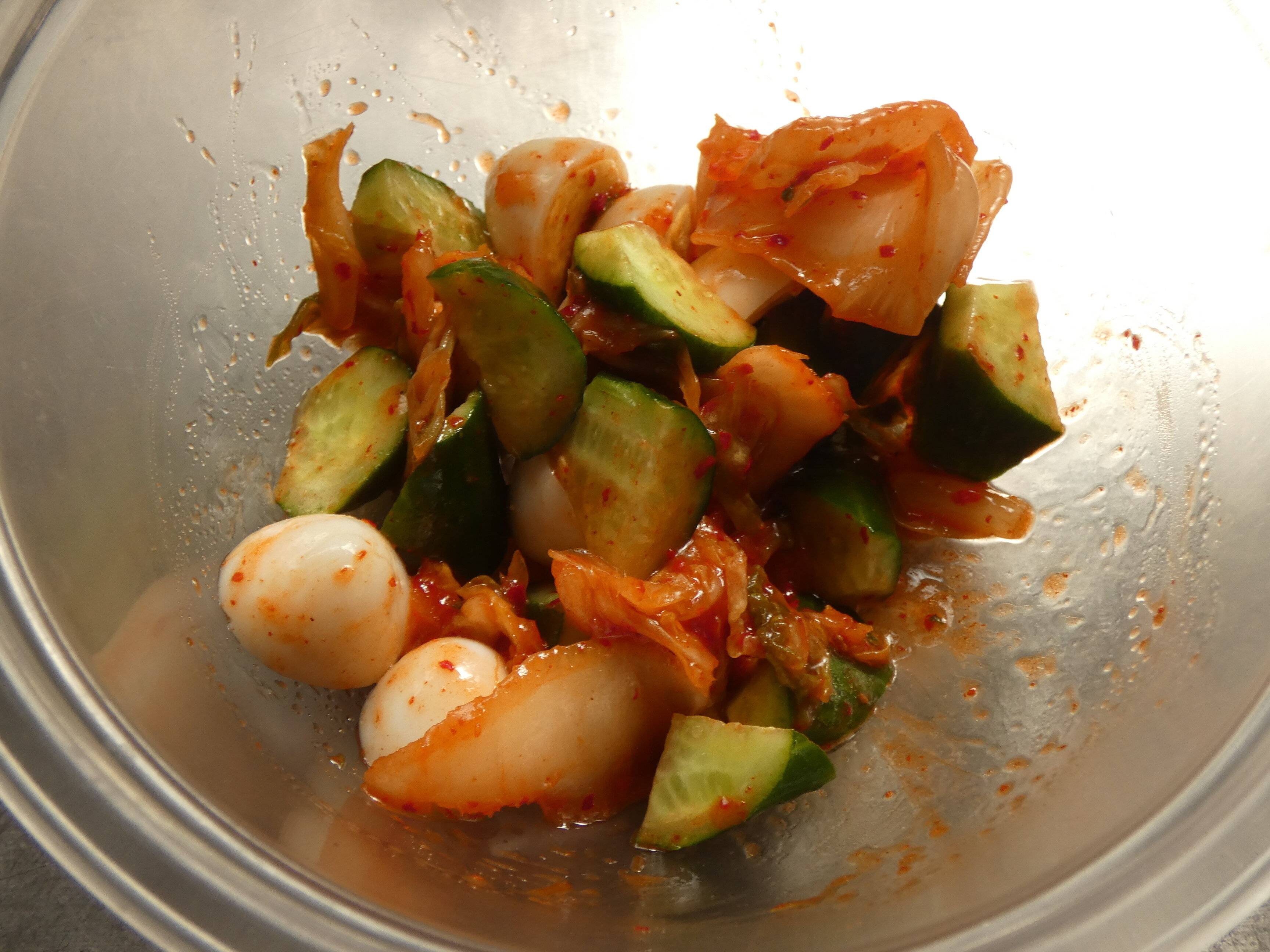 2.うずらとキュウリ、キムチとごま油を混ぜたら完成。