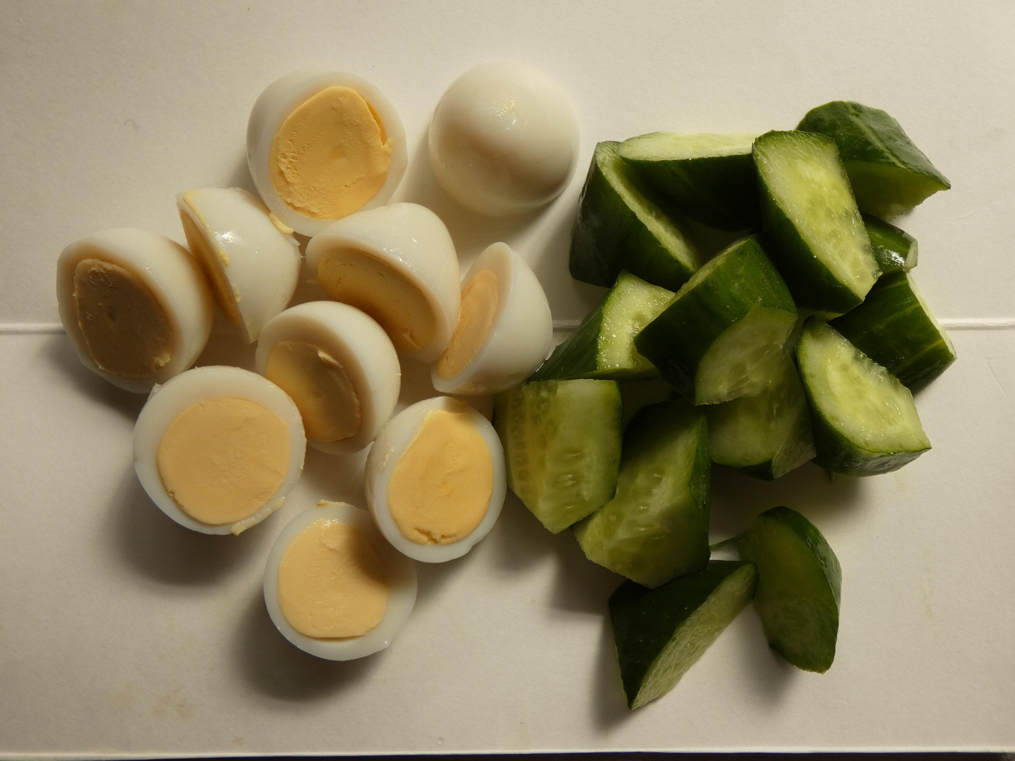 1.うずらは半分に切り、キュウリは乱切りにします。