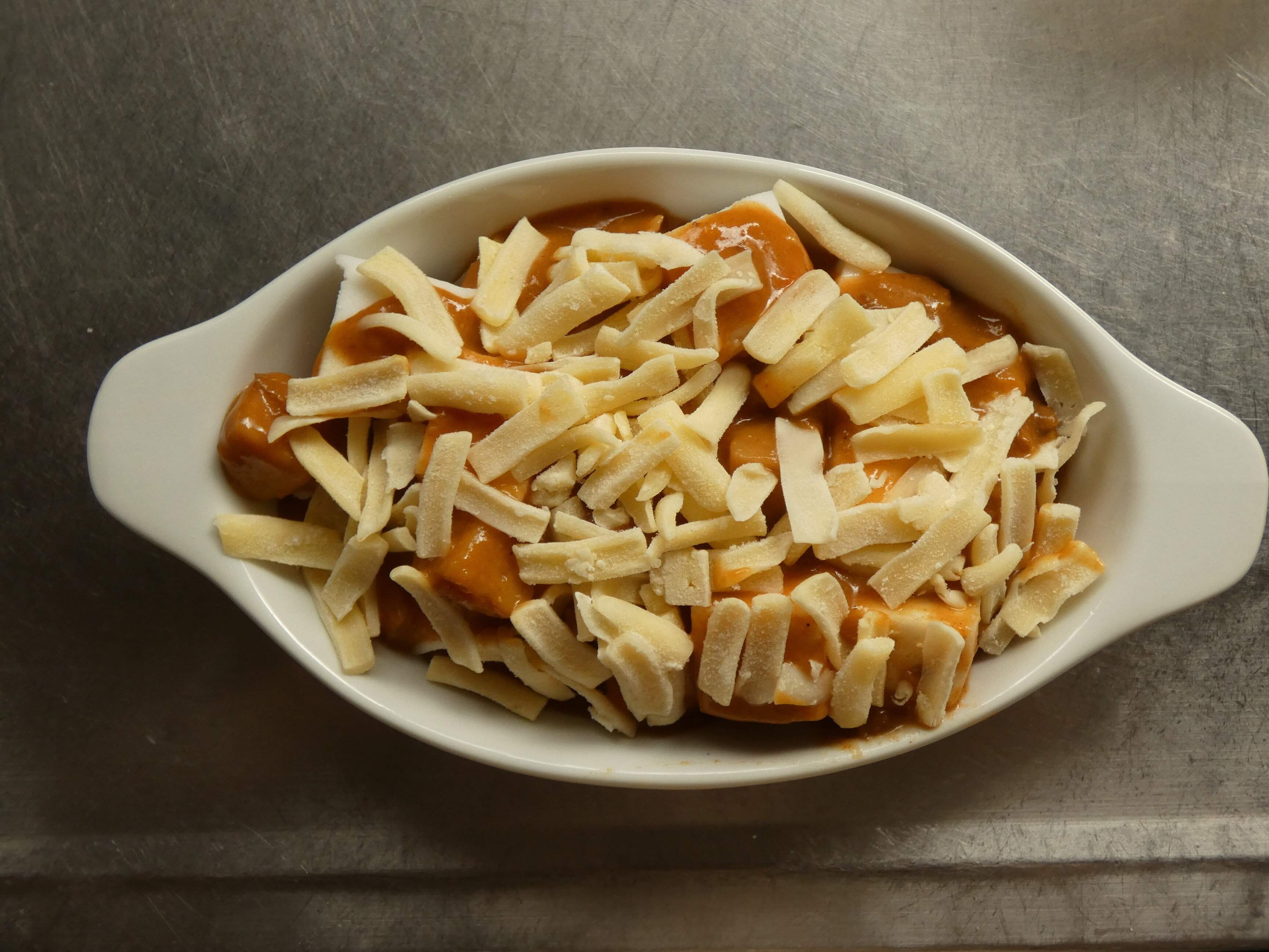 2.耐熱皿にはんぺん、レトルトカレー、ピザ用チーズを順に乗せます。トースターで焼き、チーズがとろけて焦げ目がついたら完成。