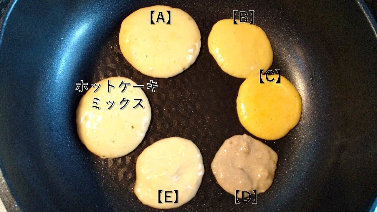 上記のポイントを押さえ、【A】~【E】のすべての材料をそれぞれボウルに合わせて混ぜ、できるだけ素早く弱火で熱したフライパンに丸く落とし、蓋をして両面3分ずつ焼きました。その後、皿に取り出し温かいうちに食べ比べてみました。