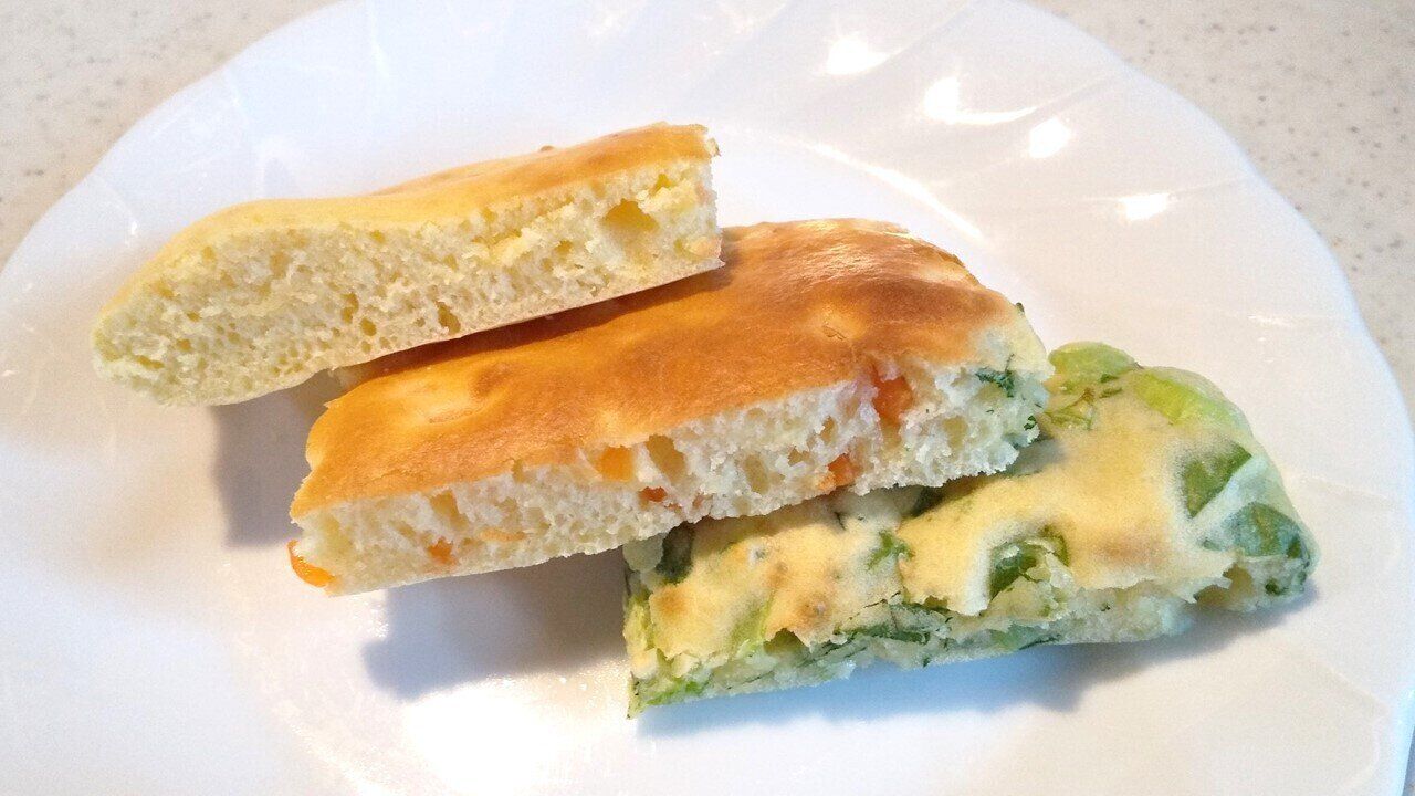 小麦粉を使った多くのお菓子づくりに利用できるだけでなく、余った野菜や総菜などを混ぜ込んで焼くことでお手軽な一品をつくることもできるホットケーキミックス。筆者は今回の検証で余った生地に、刻んだ小松菜、にんじん、プロセスチーズをそれぞれ分けて混ぜ込み、クッキングシートを敷いた天板の上に並べて広げてオーブンで焼き、「薄焼きケーキ風」にアレンジしてみました。