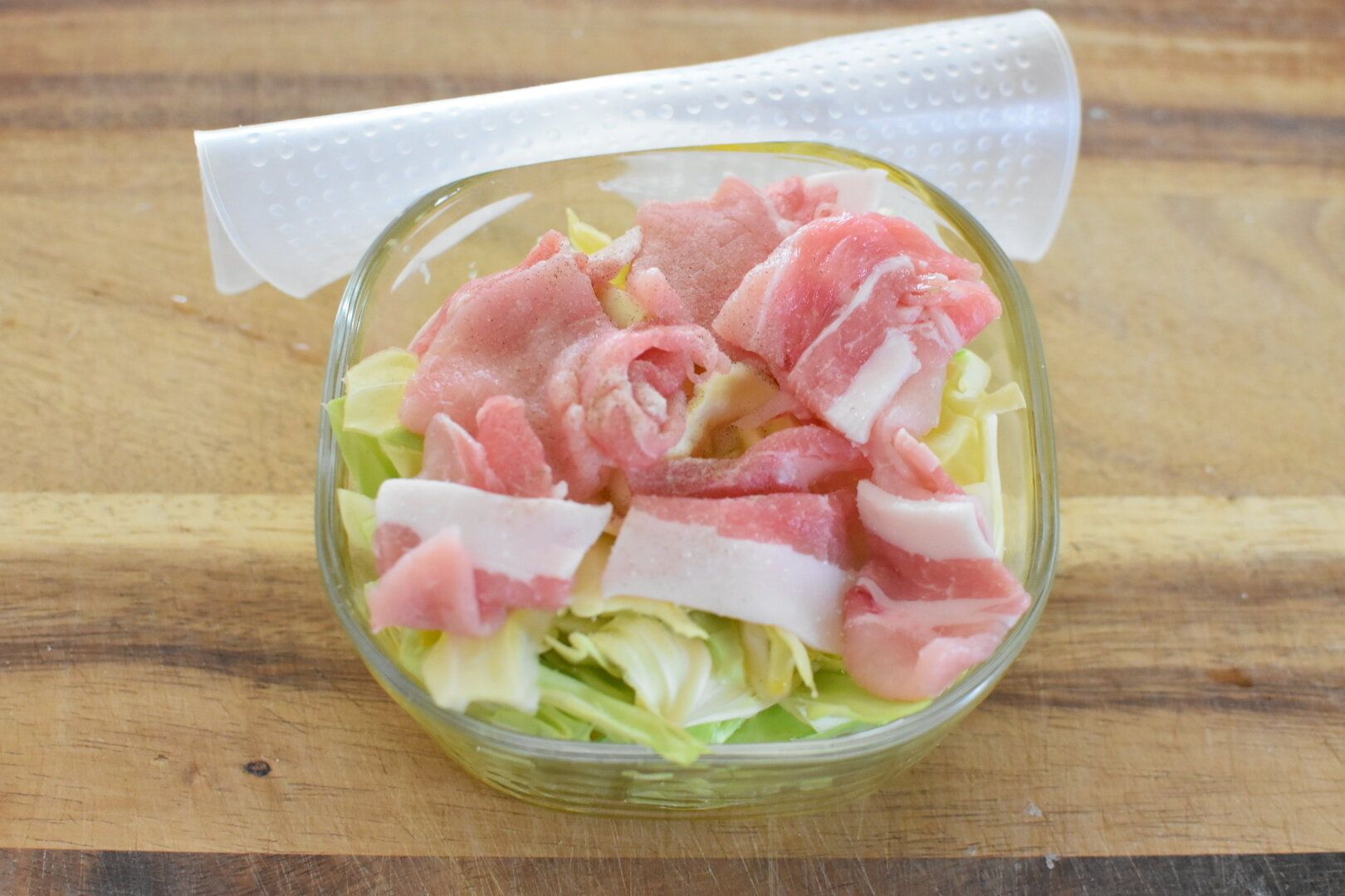 3.電子レンジ600Wで4分~5分加熱し、豚肉の色が変わっていれば取り出す