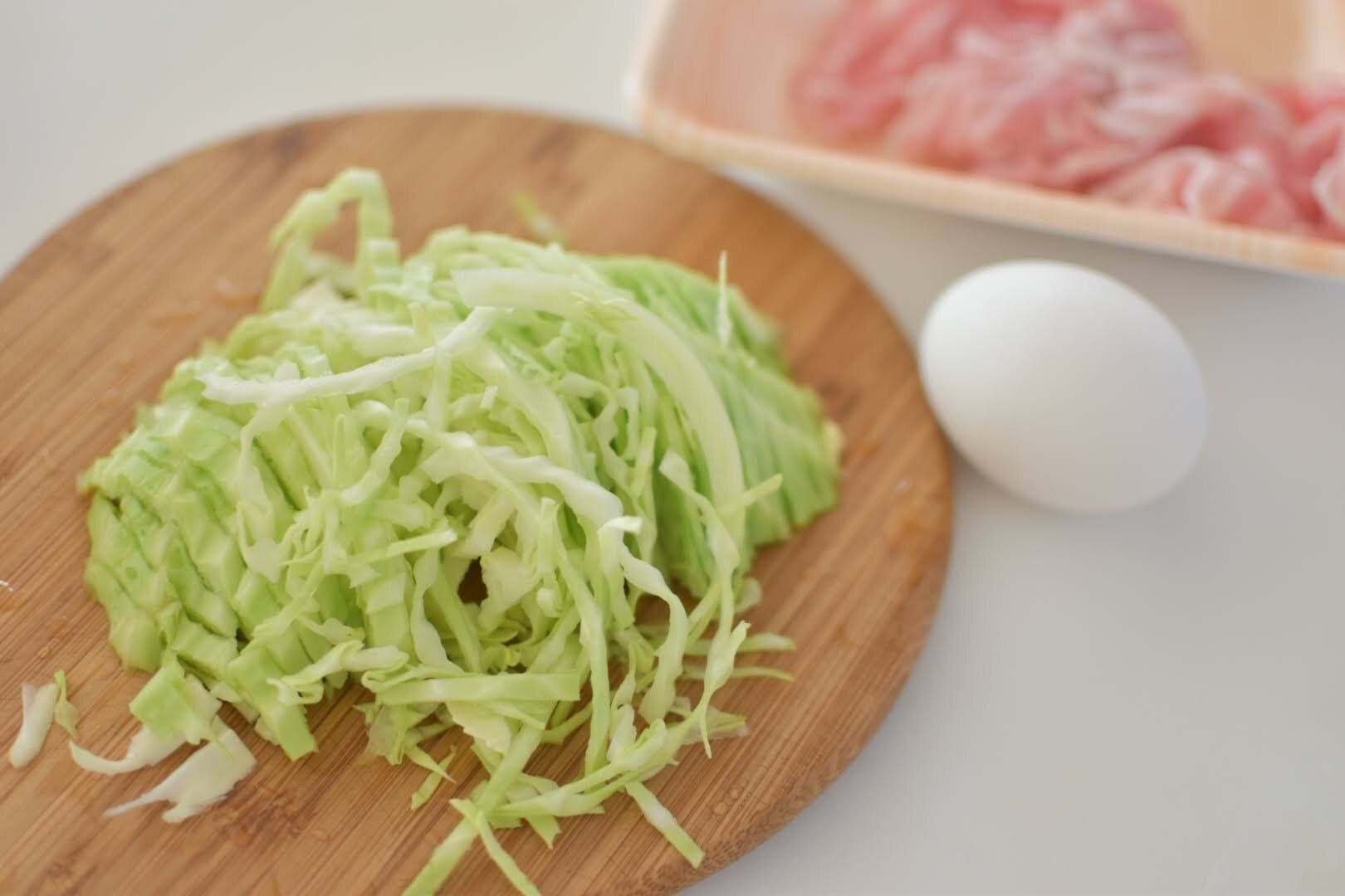 1.キャベツは食べやすいようざく切りにして耐熱容器へ入れる。卵も割り入れてキャベツに絡ませておく