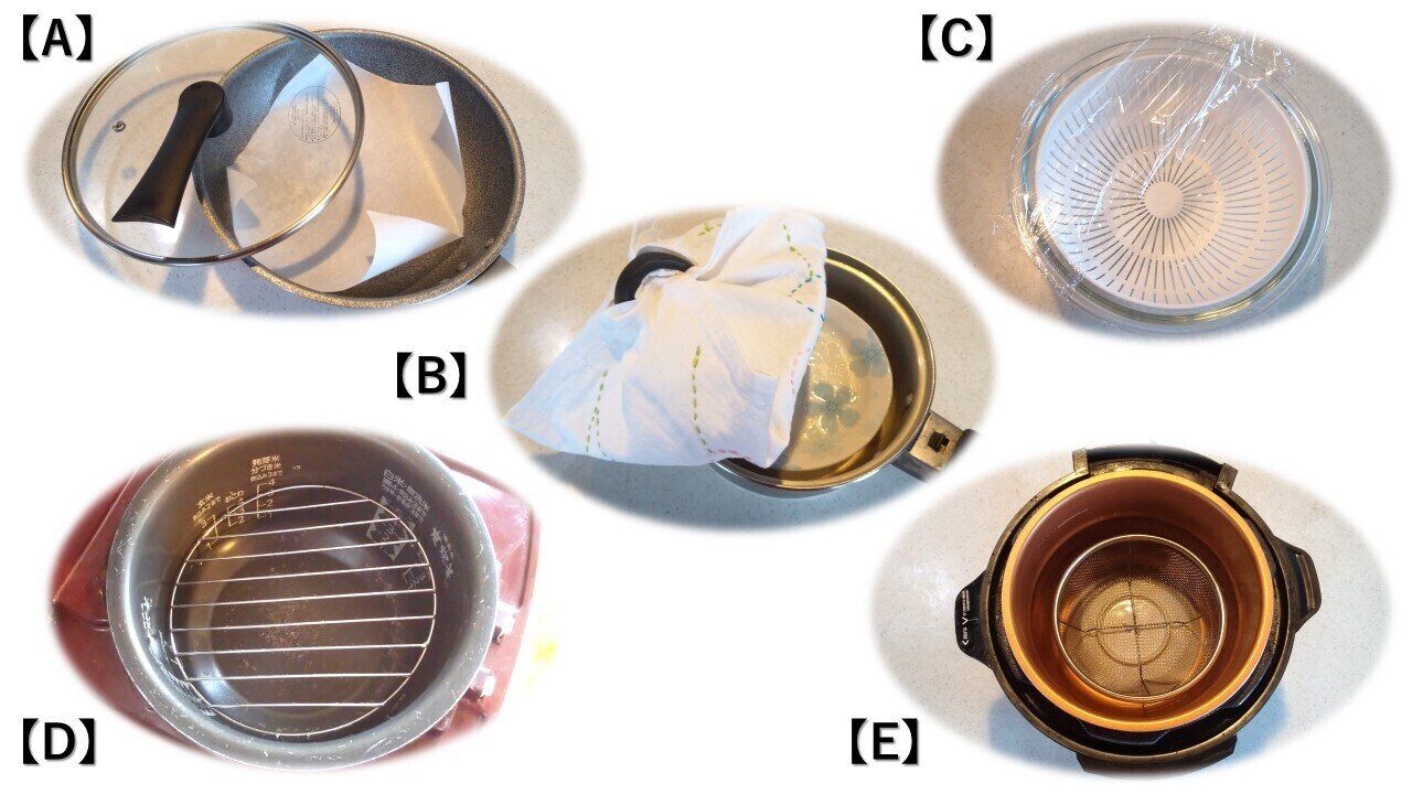 筆者の自宅にあったもののなかで、代用「蒸し器」になりそうなものは以下のとおり。調理工程も合わせて説明します。