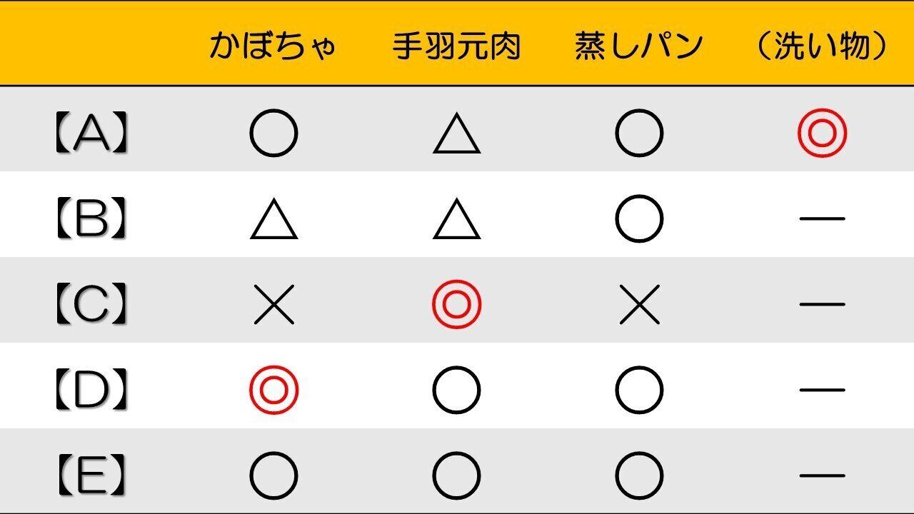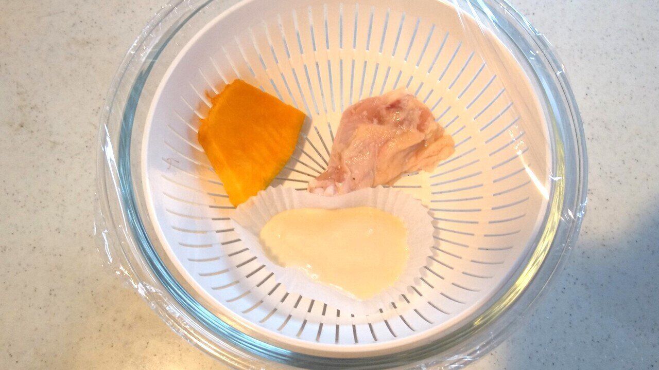 かぼちゃ、手羽元肉、蒸しパンをつかい、【A】~【E】の代用蒸し器の使い勝手について検証してみました。