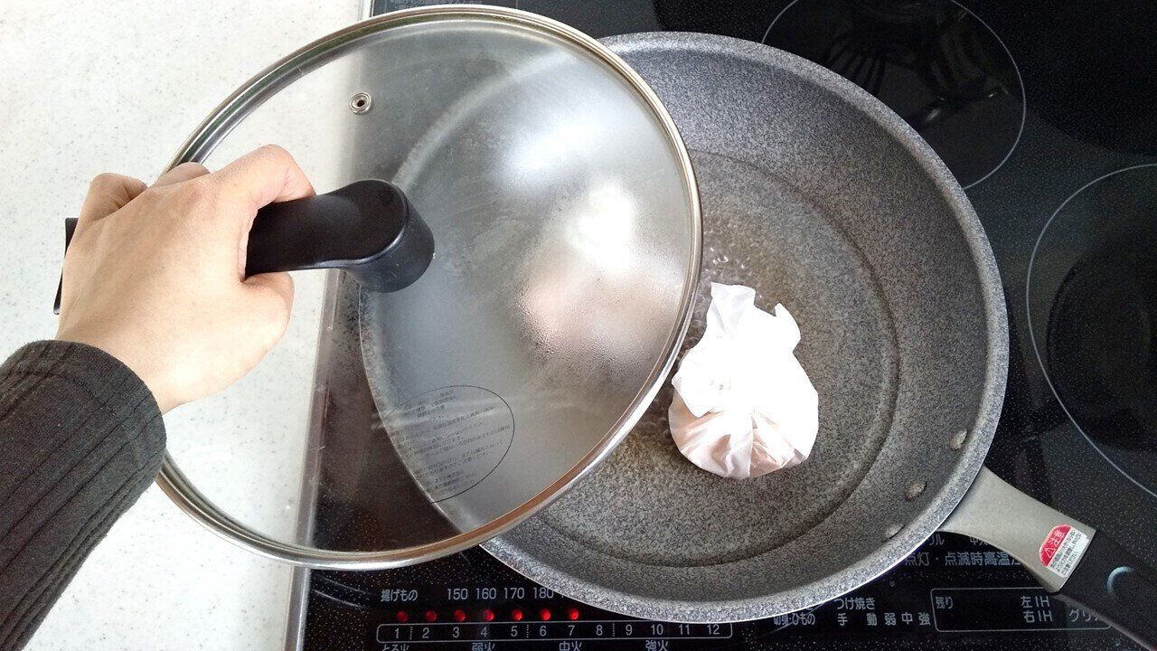 食材を1つずつクッキングシートに包んだ状態でフライパンに置き、水を注いだら火にかけて沸騰したらふたを閉じる。弱~中火で5分間加熱後、火を止めてそのまま5分放置。