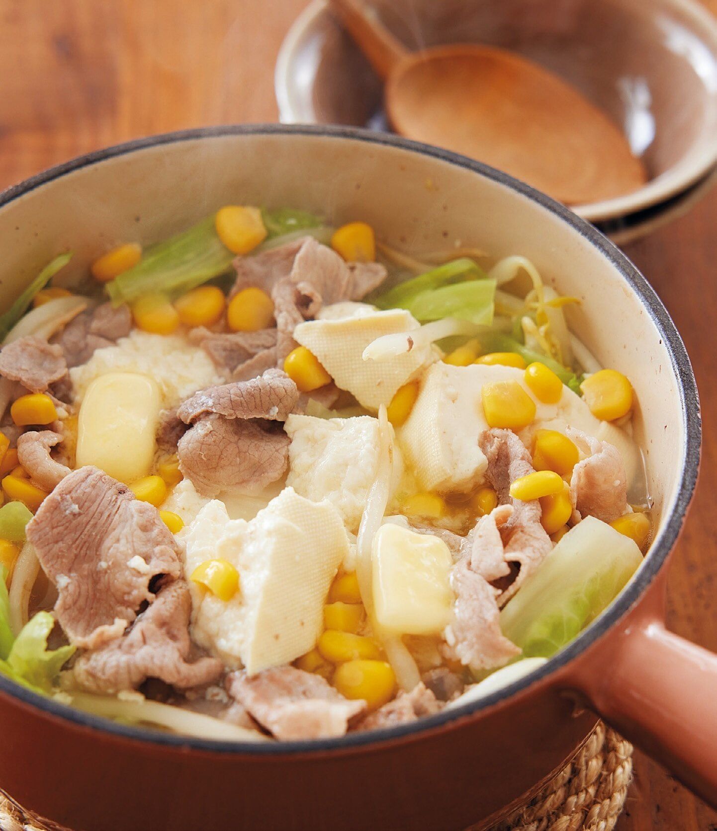 (2)(1)のアクを取り、キャベツともやしを加えてさっと煮る。豆腐を粗く割って加え、豚肉をもどし入れ、コーン、バターをのせて温める。