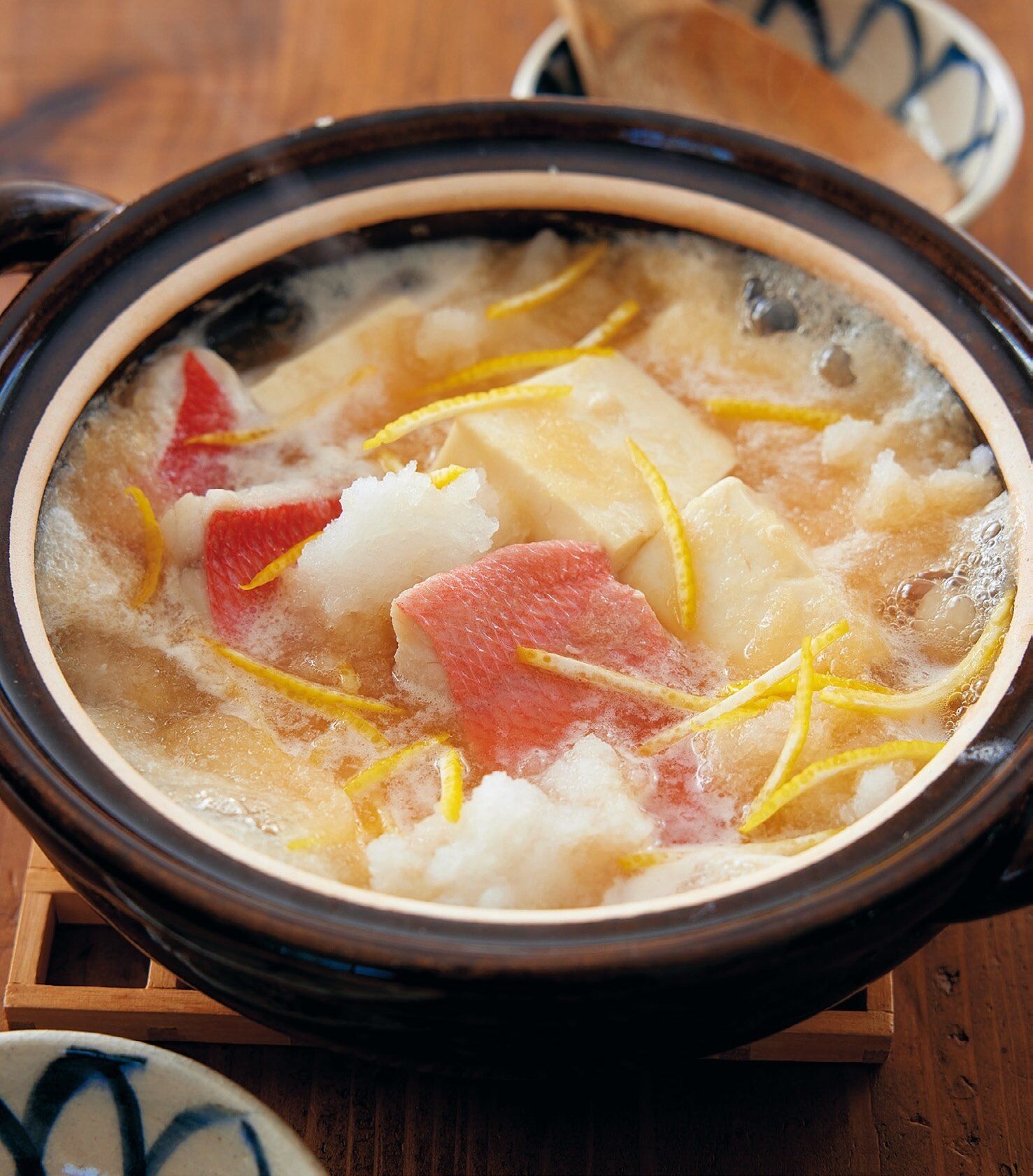 (1)小鍋に[A]と大根おろしの汁を入れて混ぜ、豆腐を並べ入れる。強めの中火にかけてひと煮立ちさせ、金目鯛を加える。煮汁を数回かけてさっと煮る。